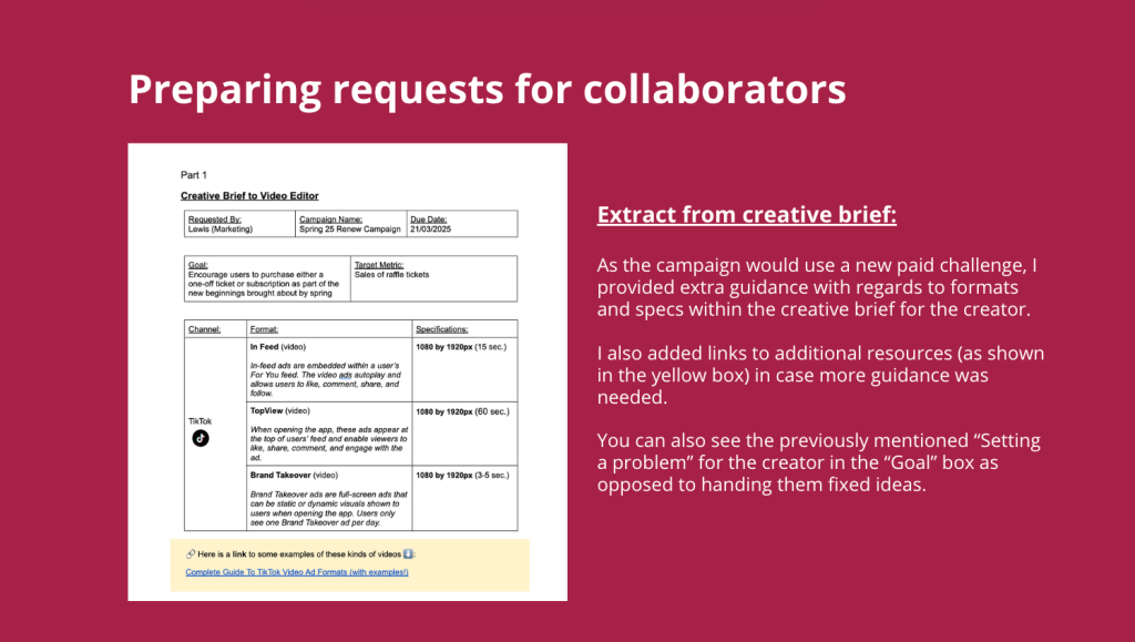 As well as this, the project allowed me to build on my skills of project management and stakeholder communication. Learning how to prepare a detailed project plan for the upcoming campaign as well as designing effective creative briefs has broadened my skill set and sets me up for success in terms of collaborative work within my future role.