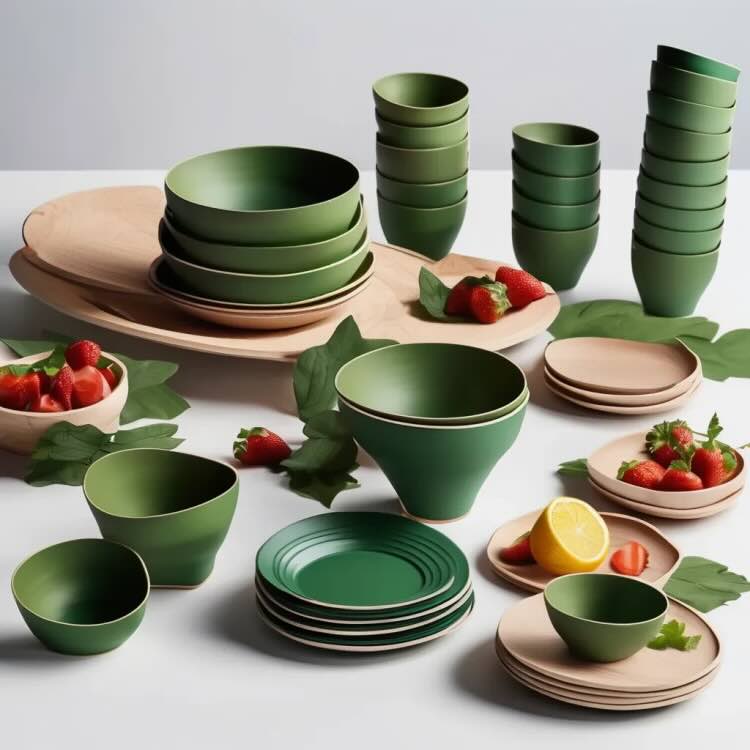 The set of 10 plates, 10 bowls and 10 cups is fully biodegradable, sustainably-sourced and made to return to nature after use.